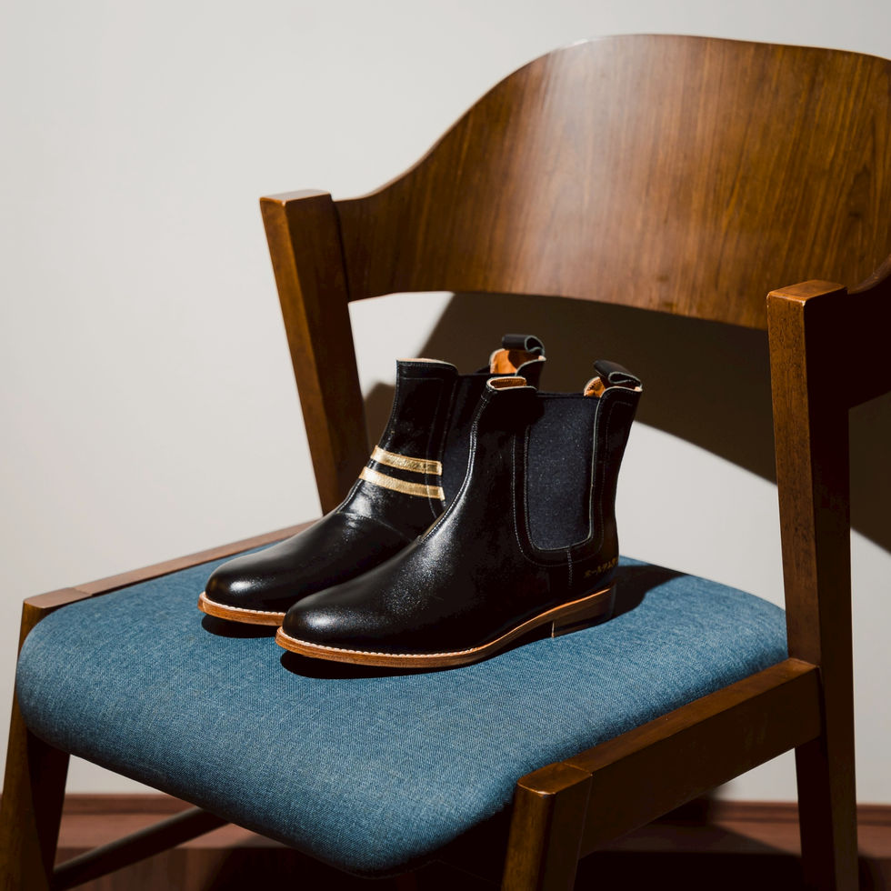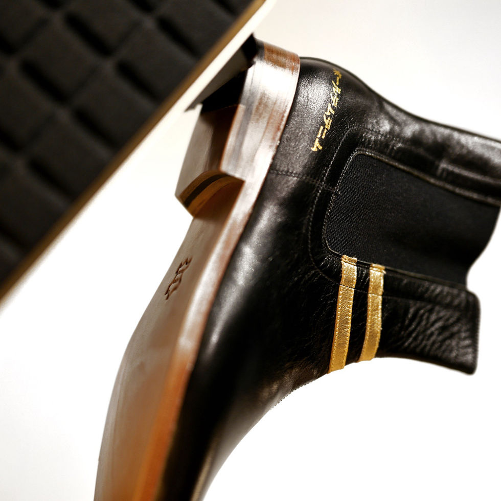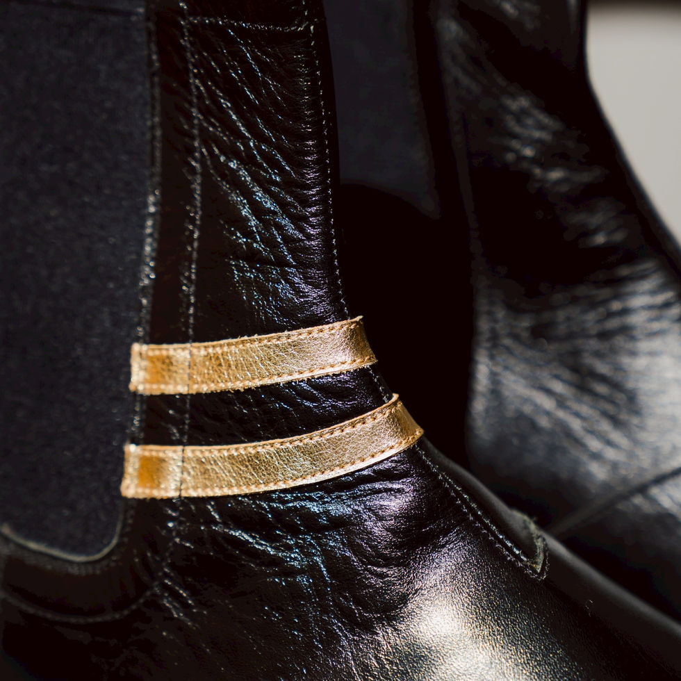 รองเท้าในรูปคือ รองเท้าบูทเชลซี (Chelsea Boots) ที่ทำจากหนังแท้สีดำ โดยมีลักษณะเด่นคือแถบคาดสีทองสองเส้นที่ด้านหน้า