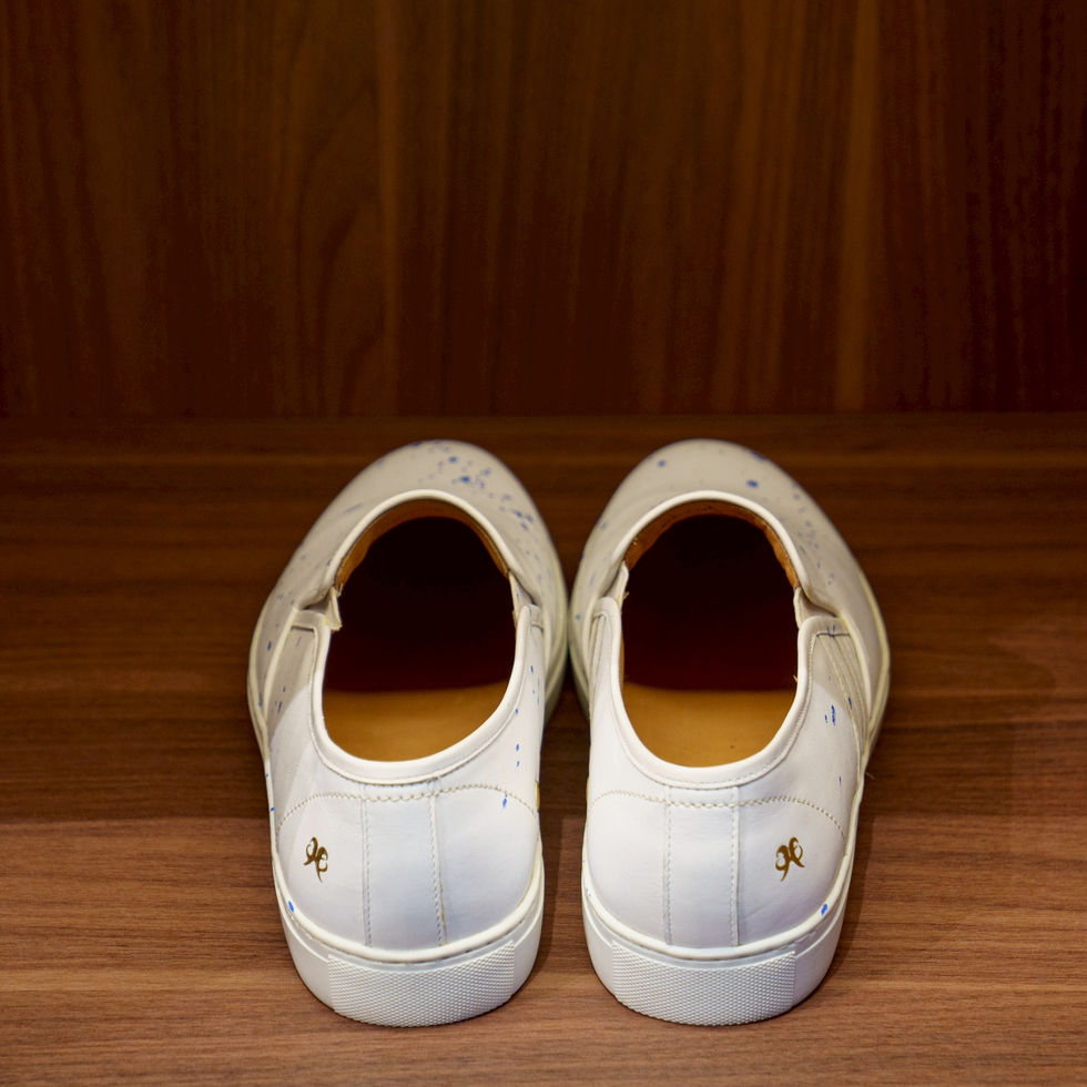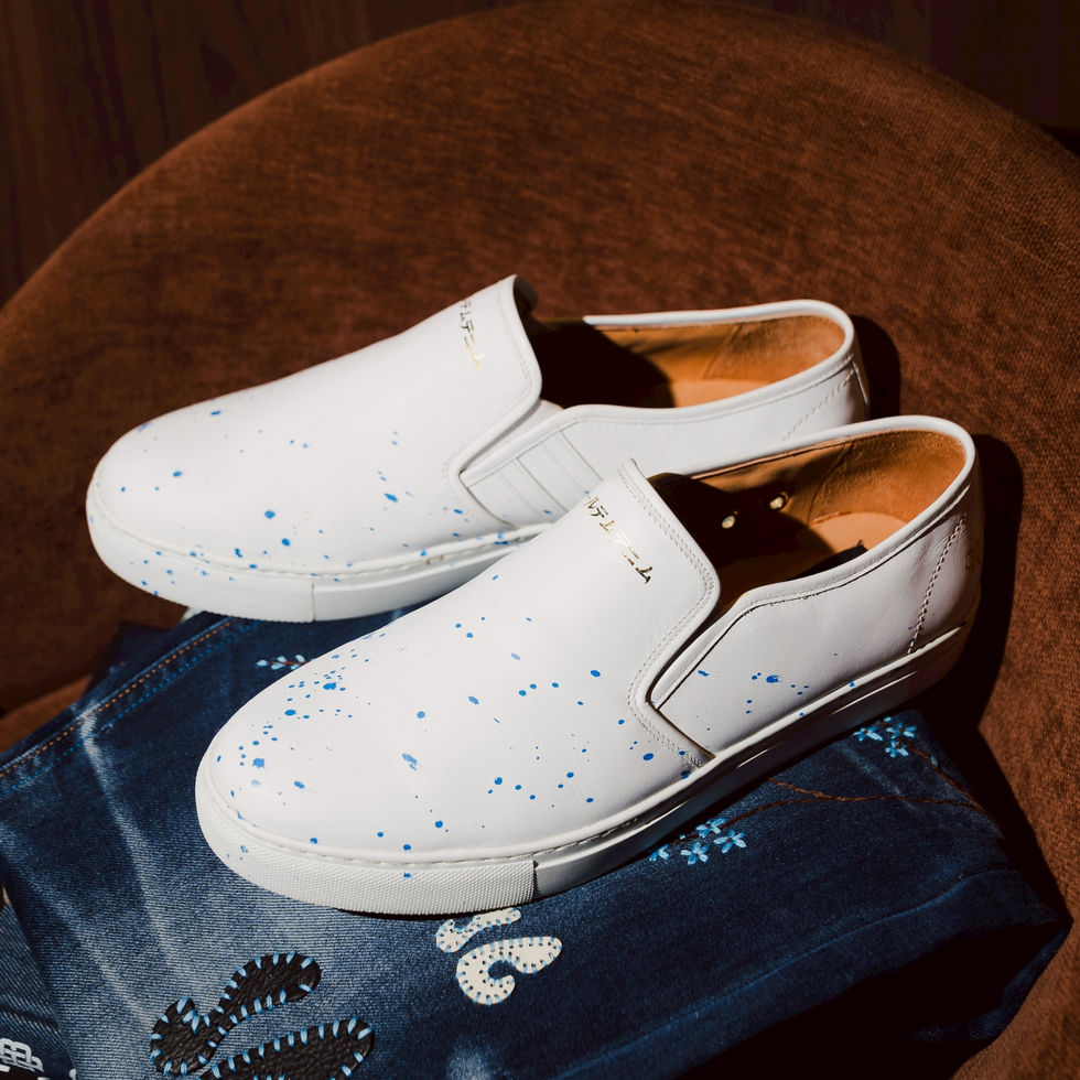 -รองเท้าในภาพคือ รองเท้าสลิปออน (Slip-on) สีขาว มีสาดสีน้ำเงินเพิ่มความโดดเด่น ตัดกับพื้นยางสีขาว ซึ่งเป็นดีไซน์ที่เน้นความเรียบหรูและสวมใส่สบาย