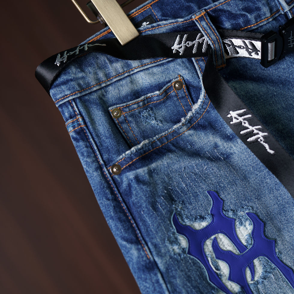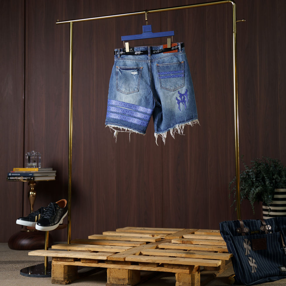 #holdemdenim #holdem Blue Washed Destroyed Denim shorts (Japanese 100% Cotton with H8 Monogram Blue🪼🪼🪼 leather)
